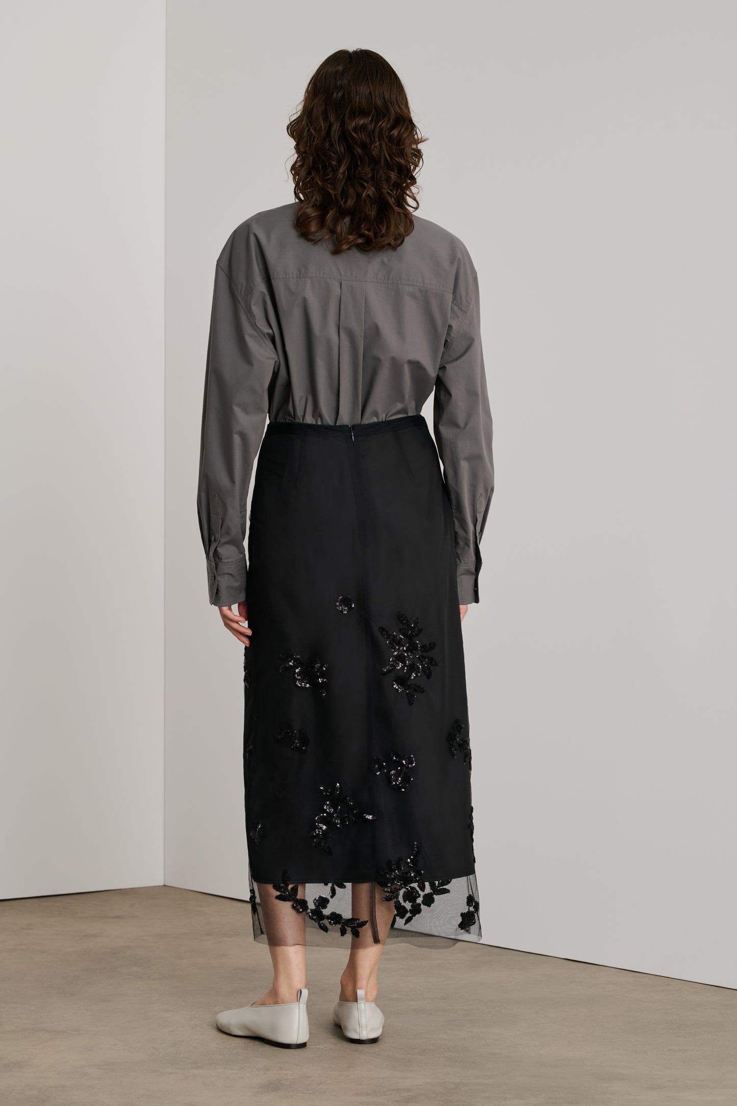 GRACE est une jupe longue élégante en tulle et applications de broderies. Faite de deux parties : un jupon doublure pour freiner la transparence, et par-dessus une jupe en tulle noire sur-brodées d'éléments floraux en sequins noirs du bas vers le haut. Elle se ferme par deux zips invisibles. Versatile cette jupe peut se porter avec ou sans son jupon selon l'audace.