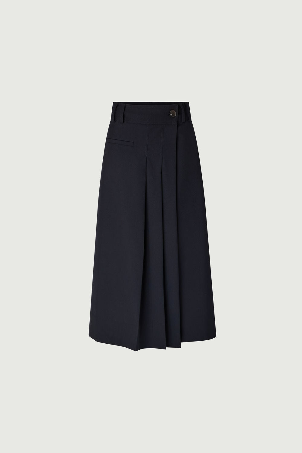 VARNA est une jupe en toile de laine navy. Inspirée du style kilt traditionnel, cette jupe se distingue par ses plis soigneusement conçus à l'avant, qui créent un mouvement fluide et raffiné.