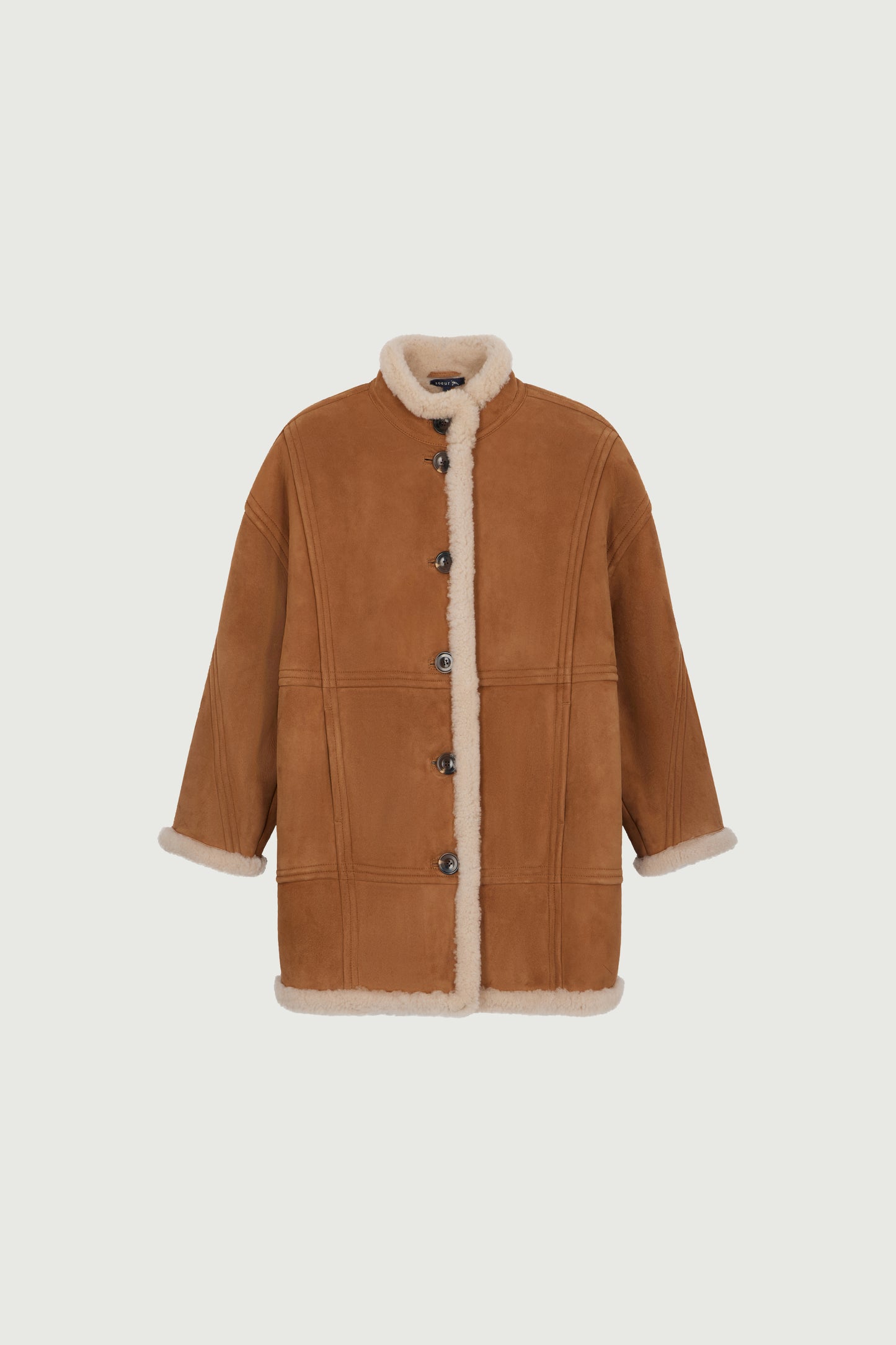 VERBIER est un manteau en peau lainée. De larges empiècements soulignés par des surpiqures ajoutent du relief à ce manteau classique et intemporel. Les poches dissimulées au devant ajoutent à son attitude oversize et décontractée.