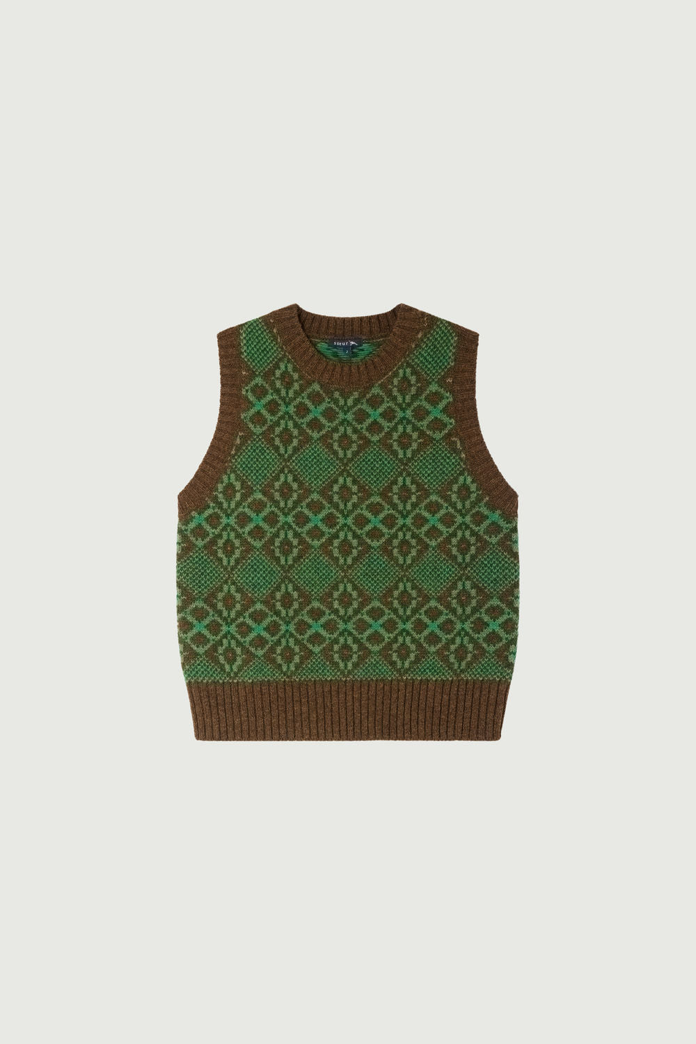 NAMASTE est un pull sans manches en alpaga et laine, véritable iconique de nos collections. Sa coupe droite et son col rond offrent une allure épurée. Parfait pour réchauffer une tenue portée avec une chemise ou un tee-shirt, il s’inscrit comme un classique revisité. Cet hiver il se décline dans un jacquard marron et vert d'inspiration anglaise.