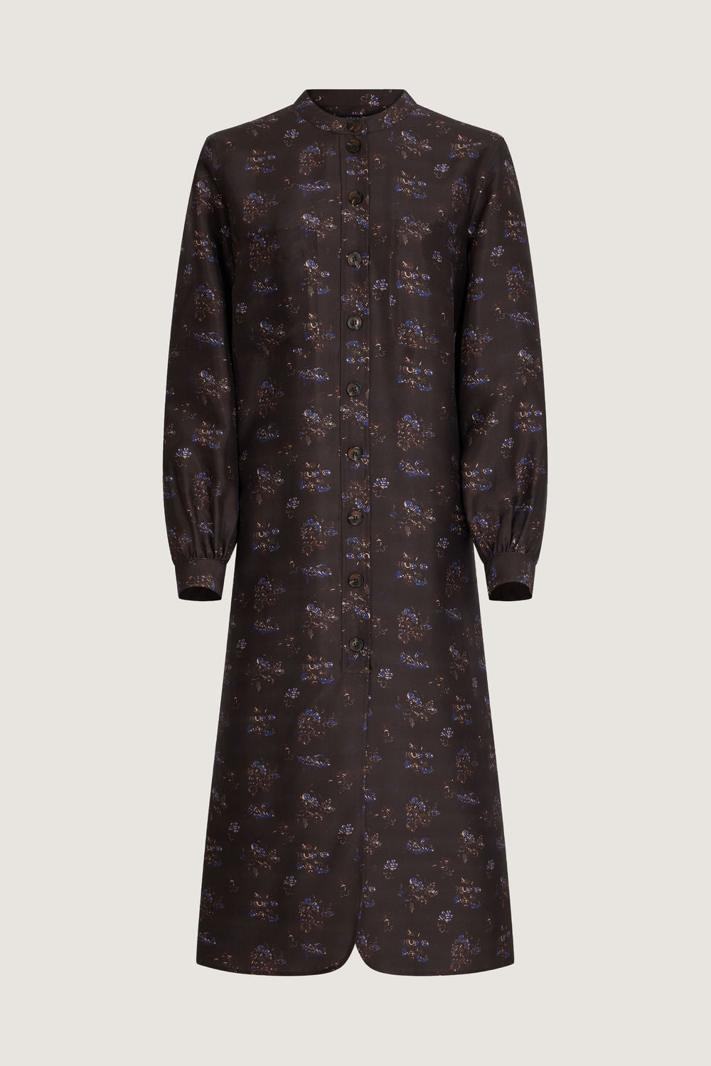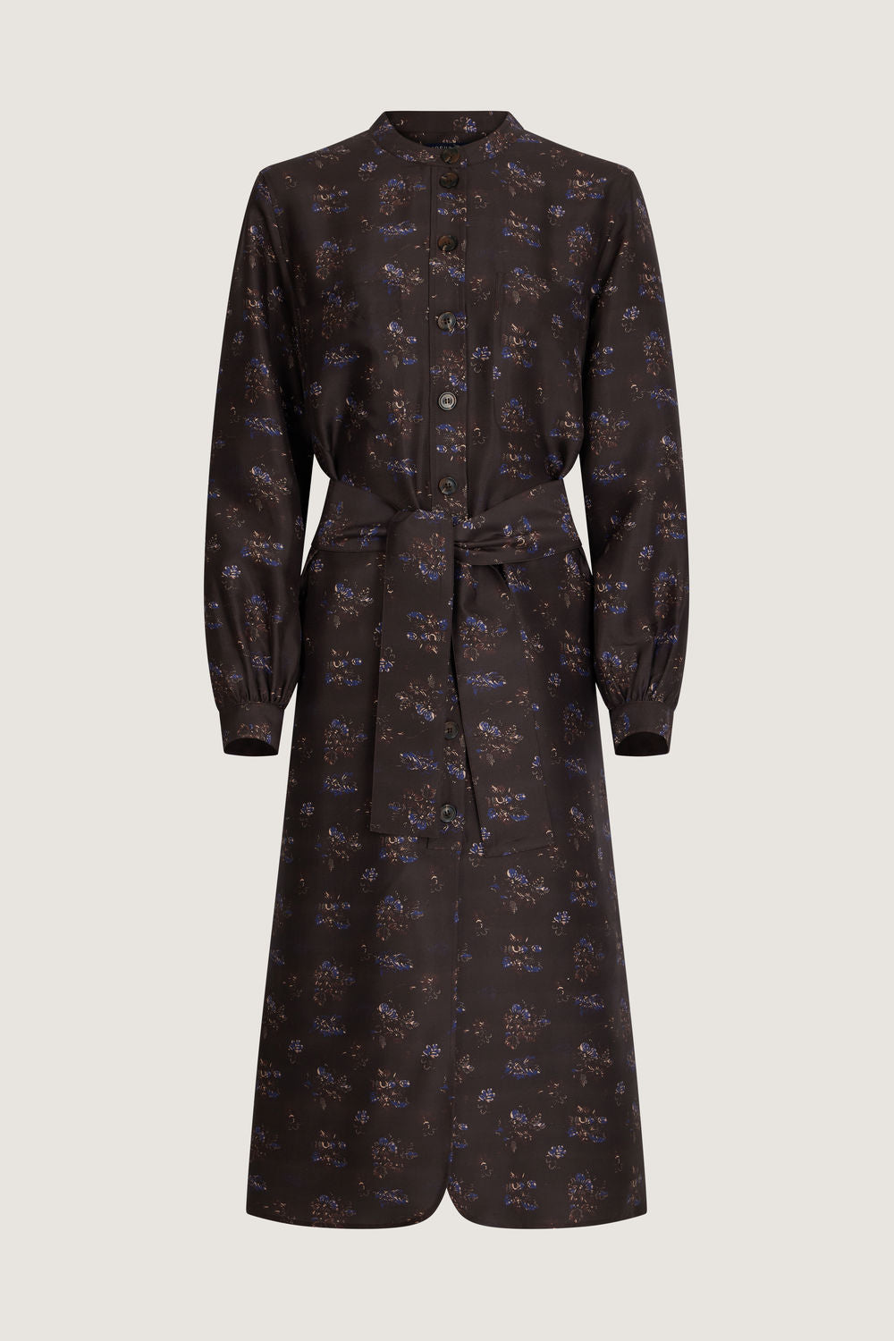 Robe en doupion de soie imprimée - Coupe longue et volume droit, se porte avec ou sans ceinture- Manches longues avec poignets boutonnés- Encolure ronde et ouverture boutonnée devant- Bas du vêtement forme liquette- Ceinture amovible