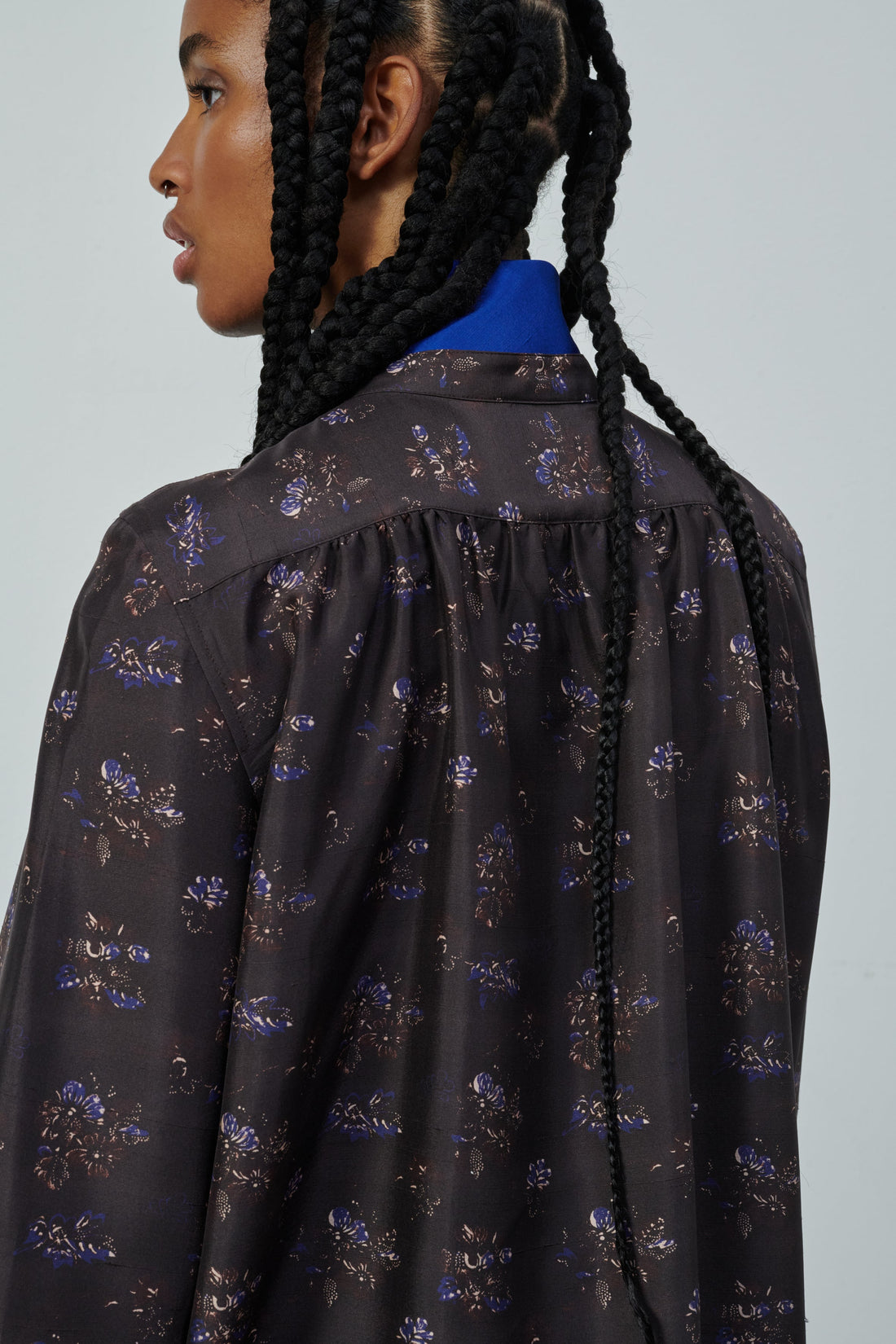 LAUREN est une robe liquette ample au dos froncé. Sur fond marron foncé, les fleurs bleues et blanches ressortent avec éclat. Elle traversera la saison automne-hiver, portée avec ou sans collant, avec des bottes ou bottines larges.