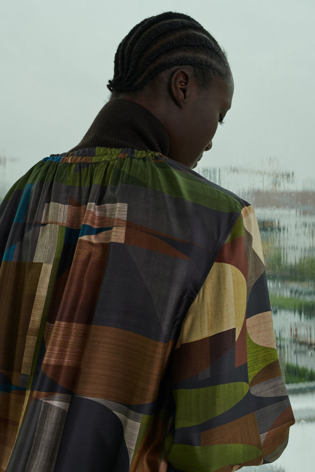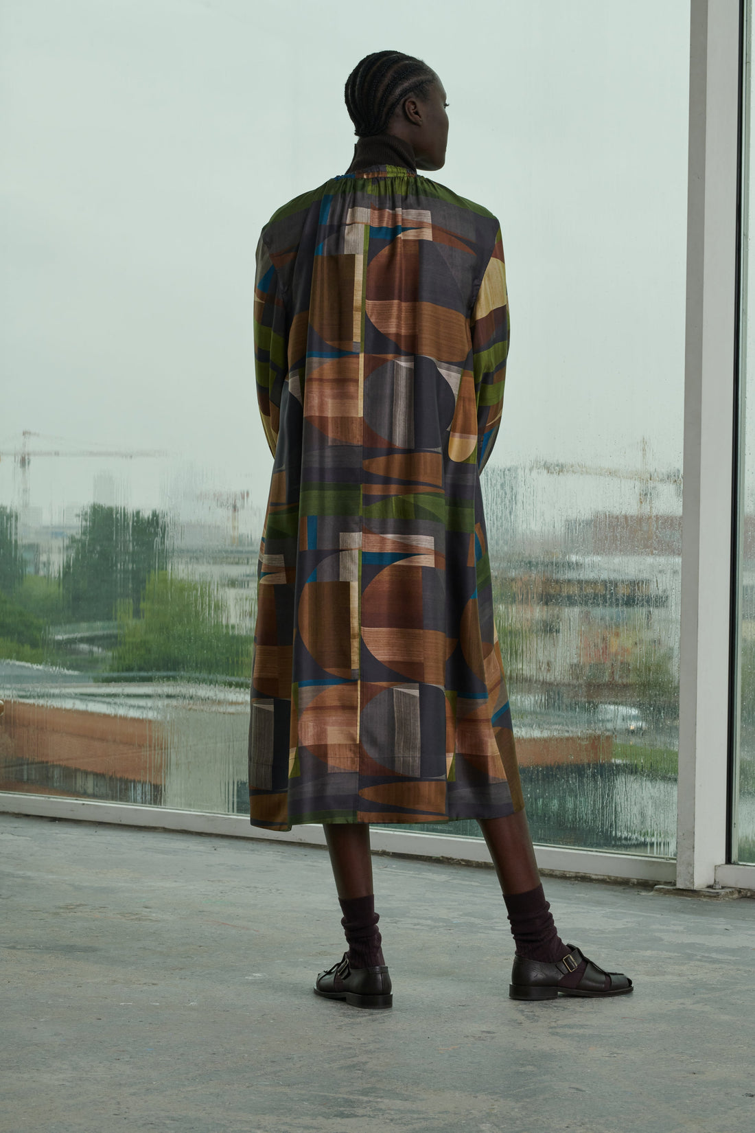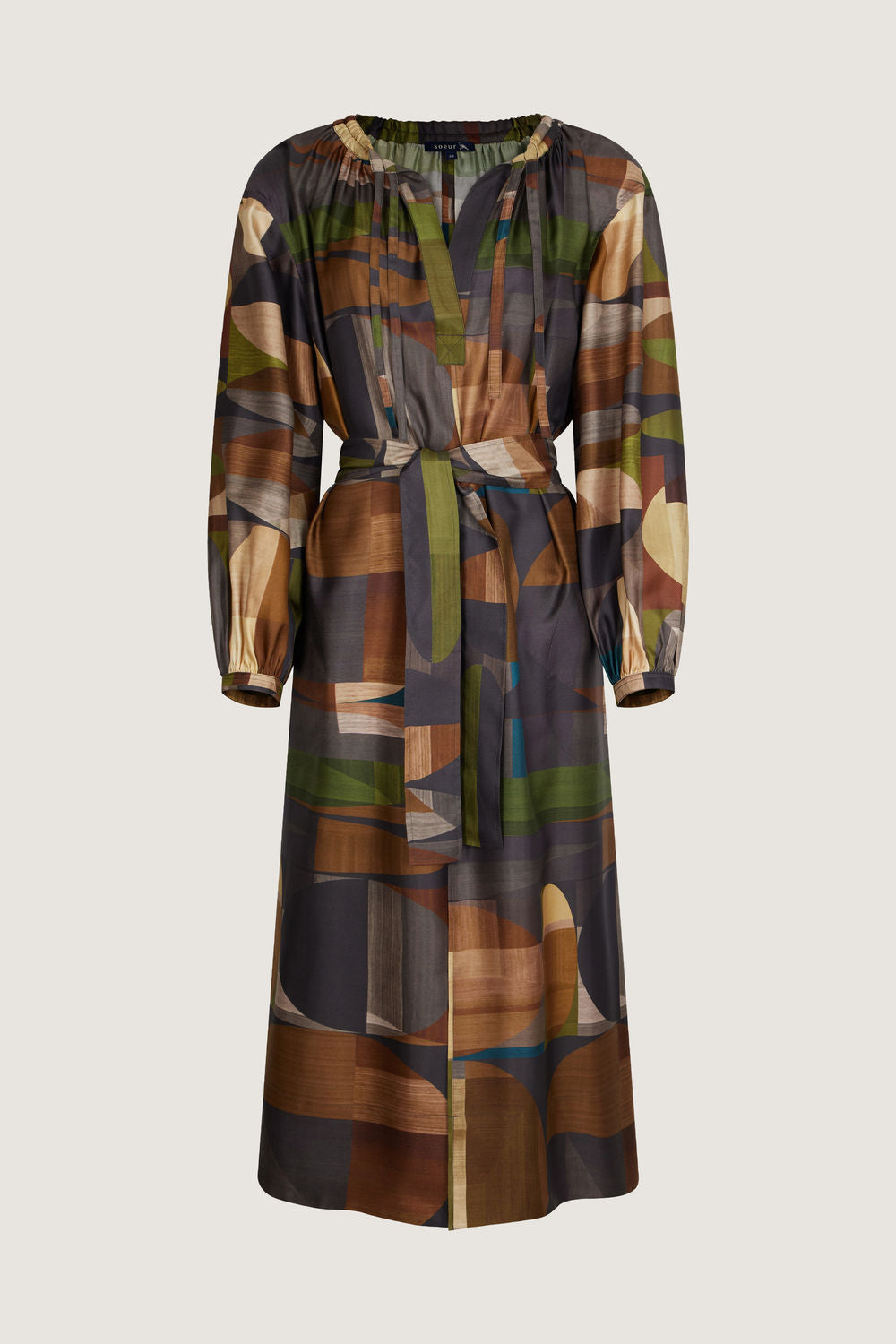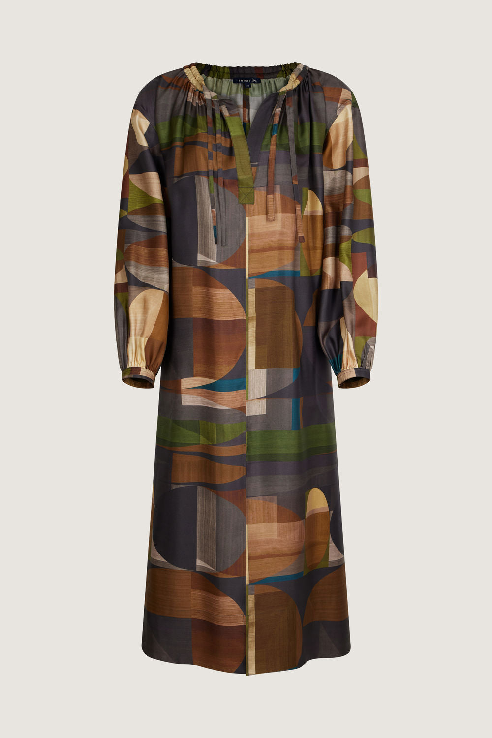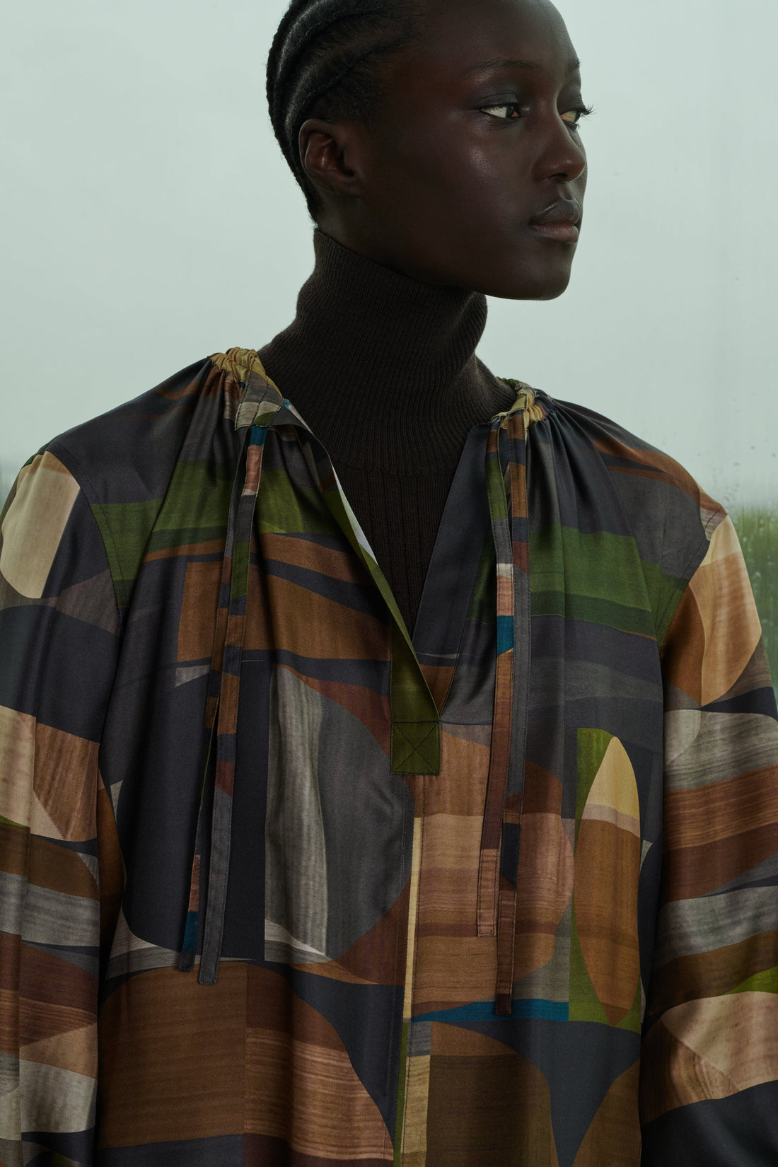 Robe ample en twill de soie imprimé - Coupe longue et trapèze- Ouverture fente sur le devant - Encolure ronde froncée et ajustable par deux liens de serrage- Deux poches insérées dans les coutures devant