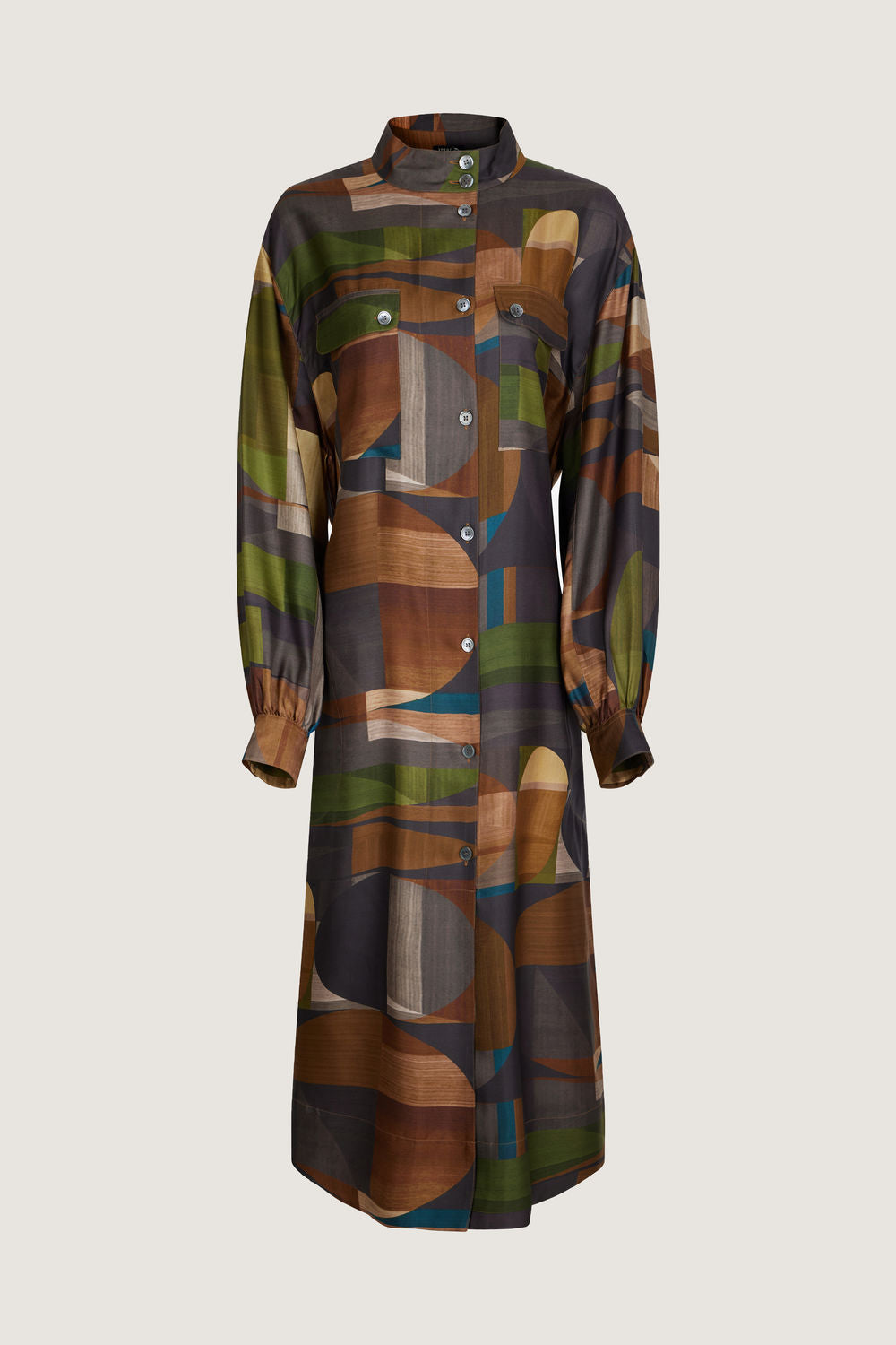 Robe col boutonné en twill de soie imprimé - Coupe longue et droite- Col montant boutonné- Manches longues et bas de manche froncé- Ouverture devant boutonnée- Deux poches poitrine ouverture boutons