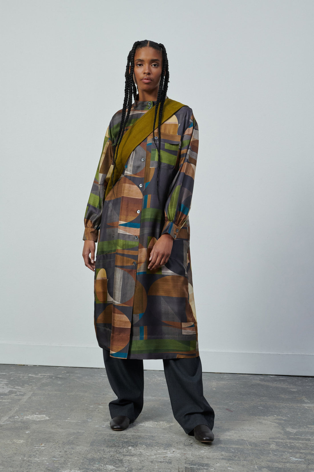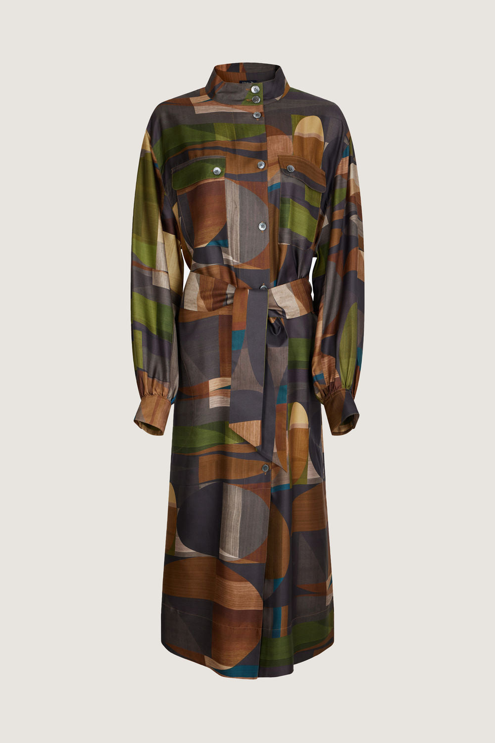 Robe col boutonné en twill de soie imprimé vert/marron