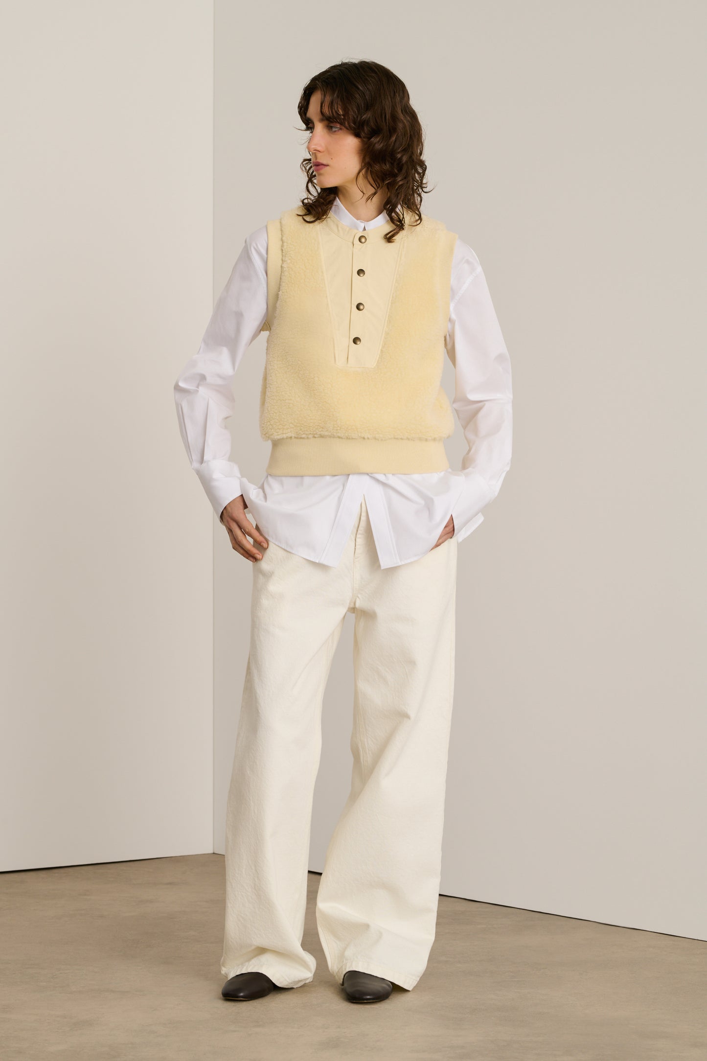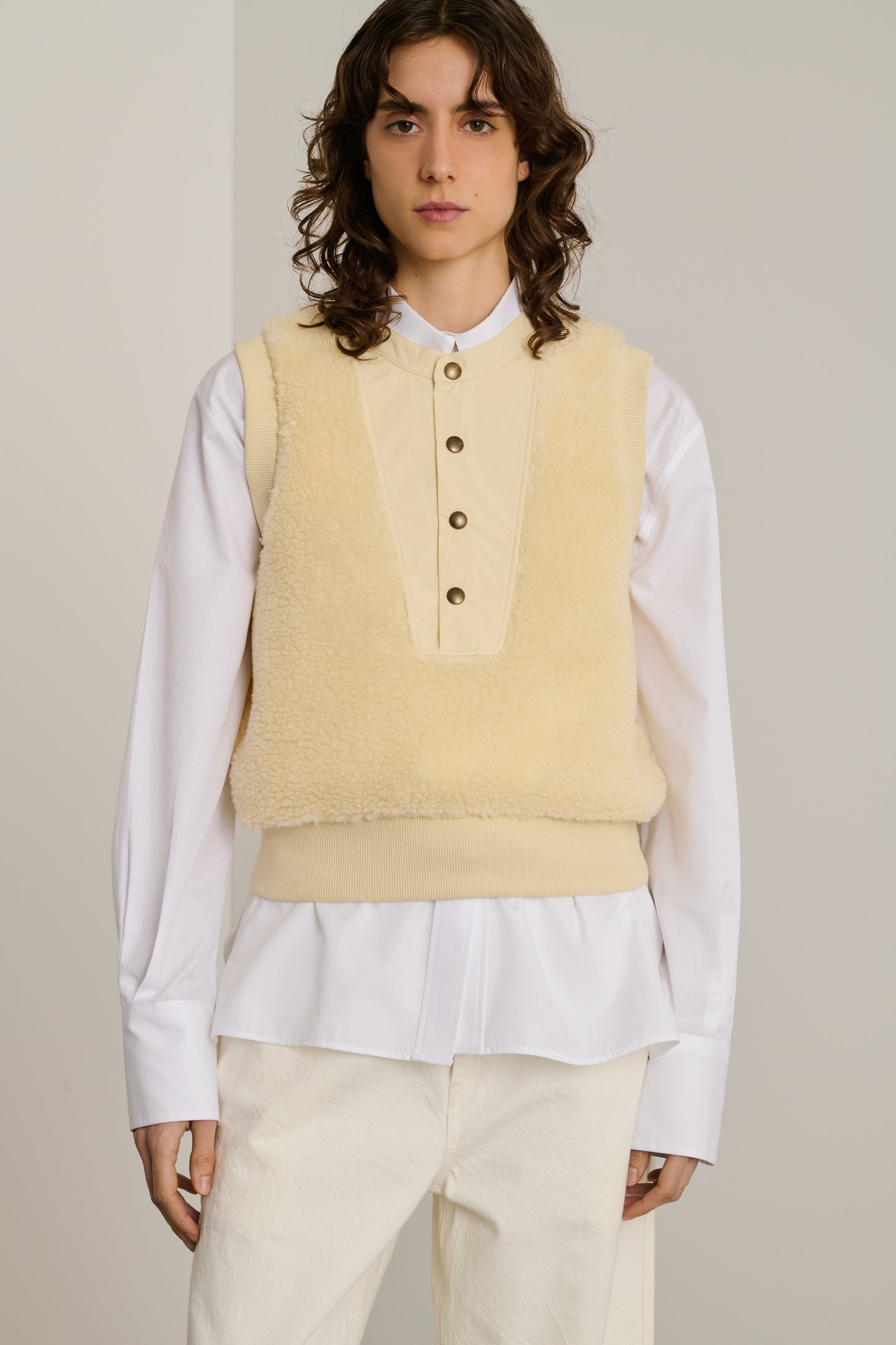 BAILA est un sweat-shirt sans manches en fausse fourrure. Sa coupe droite, subtilement resserrée au bas du corps, dessine une silhouette élégante tout en offrant une liberté de mouvement . Idéal pour superposer ou porter seul, ce sweat-shirt allie chaleur et style.